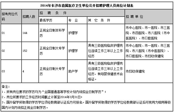 附件:2014年長沙市直屬醫(yī)療衛(wèi)生單位公開招聘護理人員崗位計劃表.xls(同下表)